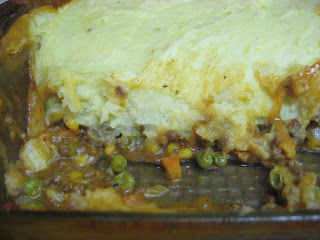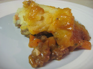 I saw this recipe on this morning's CBS Early Show and decided it would be perfect for dinner tonight because I had everything I needed and because I had been trying to think of something Irish to make. I was happy that this recipe turned out to be kosher-friendly. I found that a lot of the Irish recipes I was finding weren't. I mean, I know I can always omit the bacon or ham or whatever. But still, I needed something that was already easily made kosher without having to make a whole lot of substitutions due to my lack of motivation :) The only thing I had to do was scale the recipe down a bit. I only had a pound of beef to work with and the original recipe calls for 2 pounds of lamb. Also, I chose to omit the celery since I pretty much despise the stuff, so I just added an extra carrot. I used an 8x8 baking dish to bake mine and the "gravy" started bubbling over the sides. Probably because I forgot to scale down the amount of broth I used. But it turned out OK. I just put a baking sheet underneath of the baking dish while it was baking to avoid any drippings ending up on my stove. And I like lots of gravy anyway, so it all worked out. The only other changes I made were to use beef broth instead of chicken broth and I did not brush my potato topping with heavy cream and I used dried basil instead of thyme.